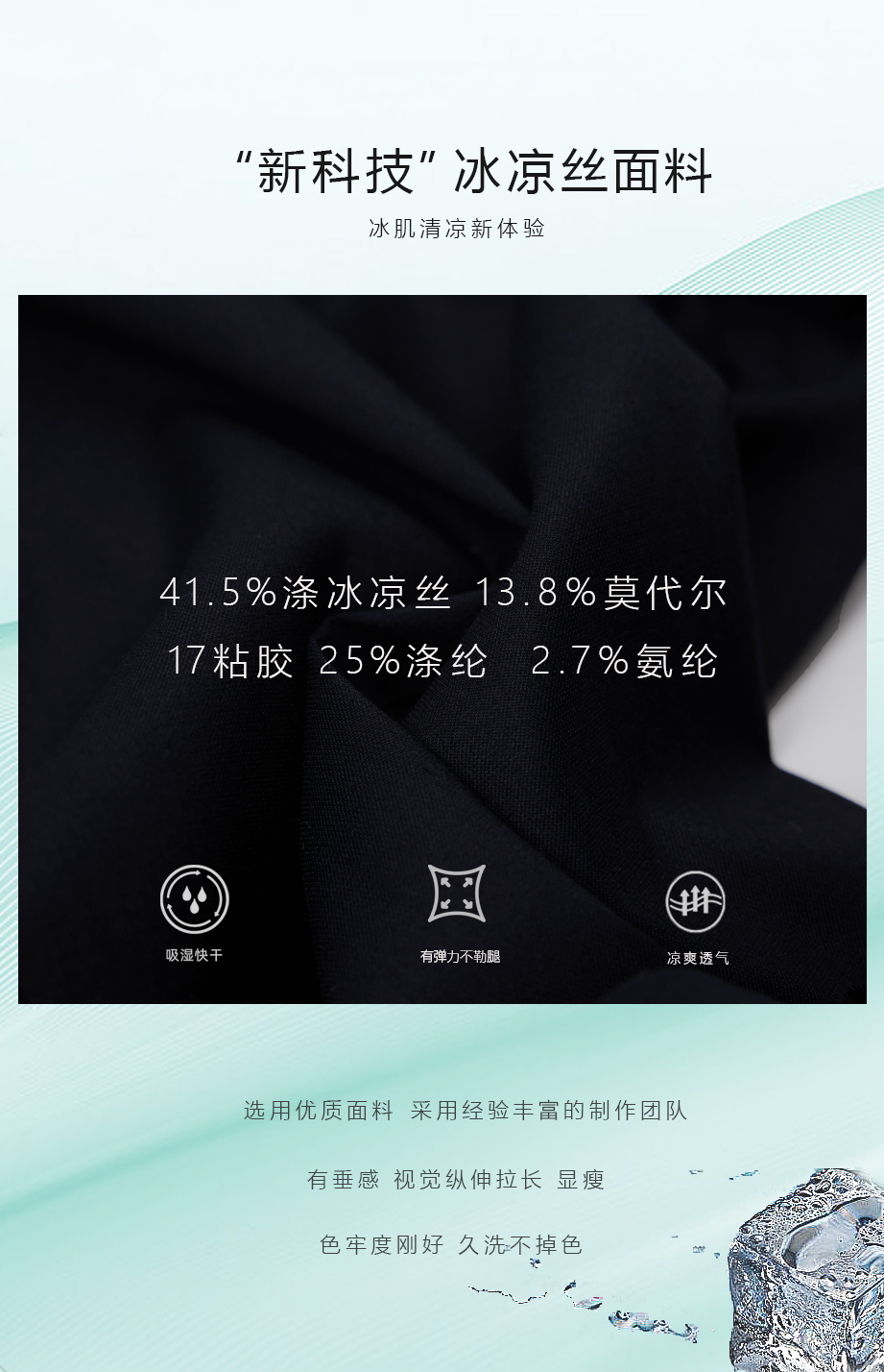 41.5%冰凉丝13.8%莫代尔17%粘胶25%涤纶2.7%氨纶 |