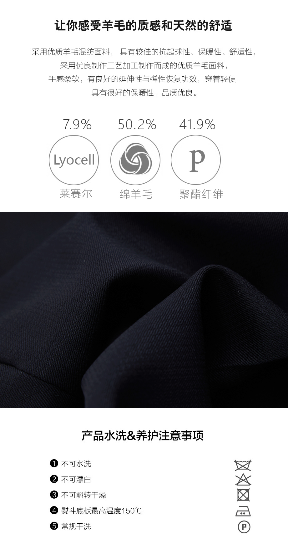 | 款名: | 深藏蓝色绵羊毛聚酯莱赛尔纤维混纺春夏西裤 | |||