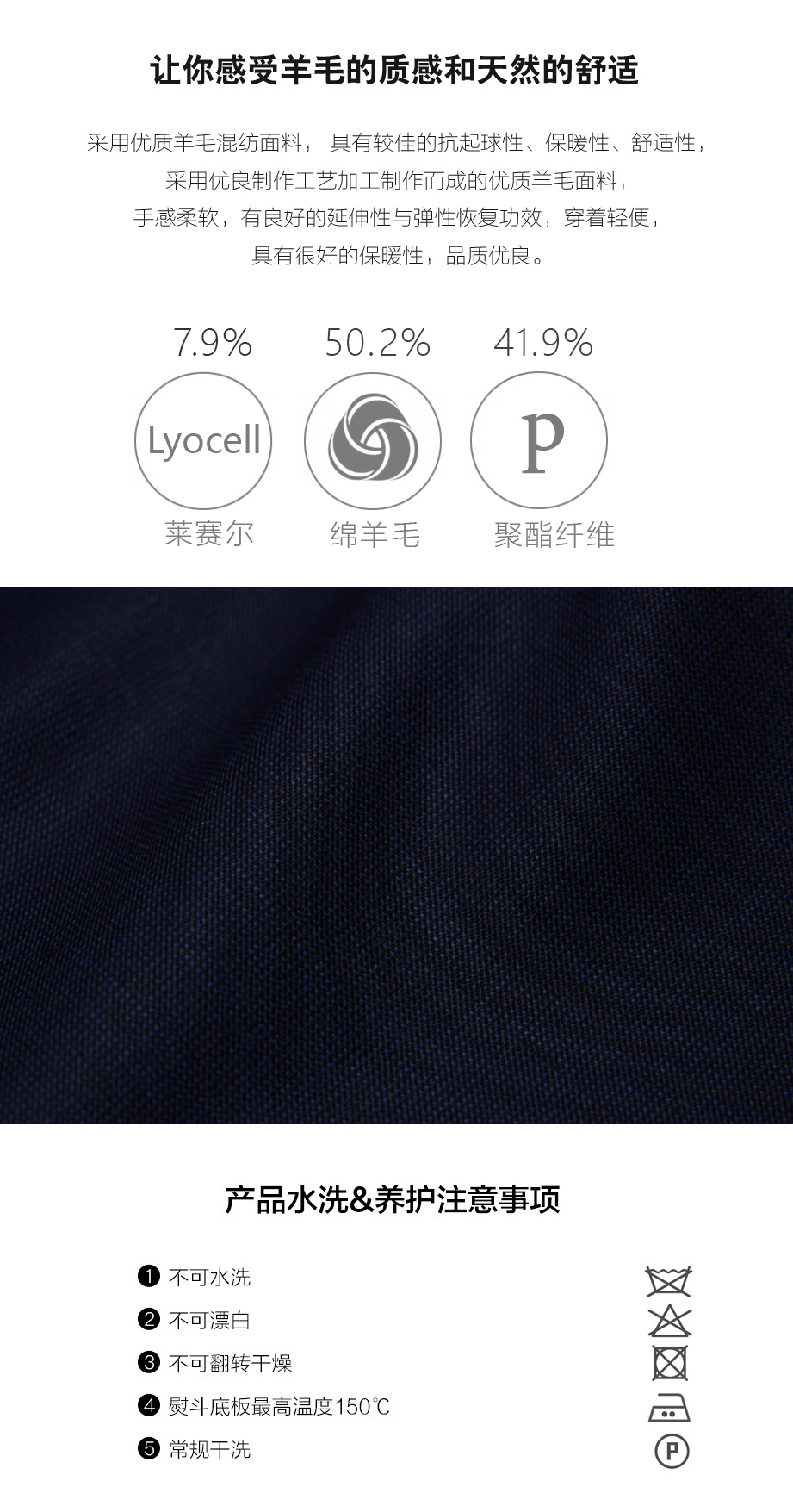 | 款名: | 海军蓝鸟眼绵羊毛聚酯莱赛尔纤维混纺春夏西裤 | |||