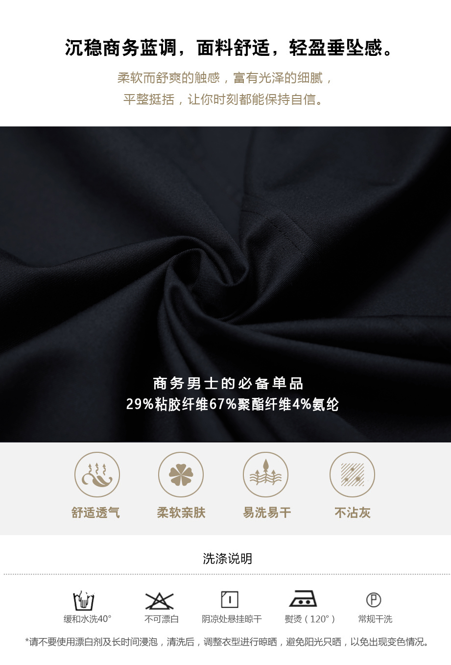 | 面料: | 67%聚酯纤维29%粘胶4%氨纶 | |||