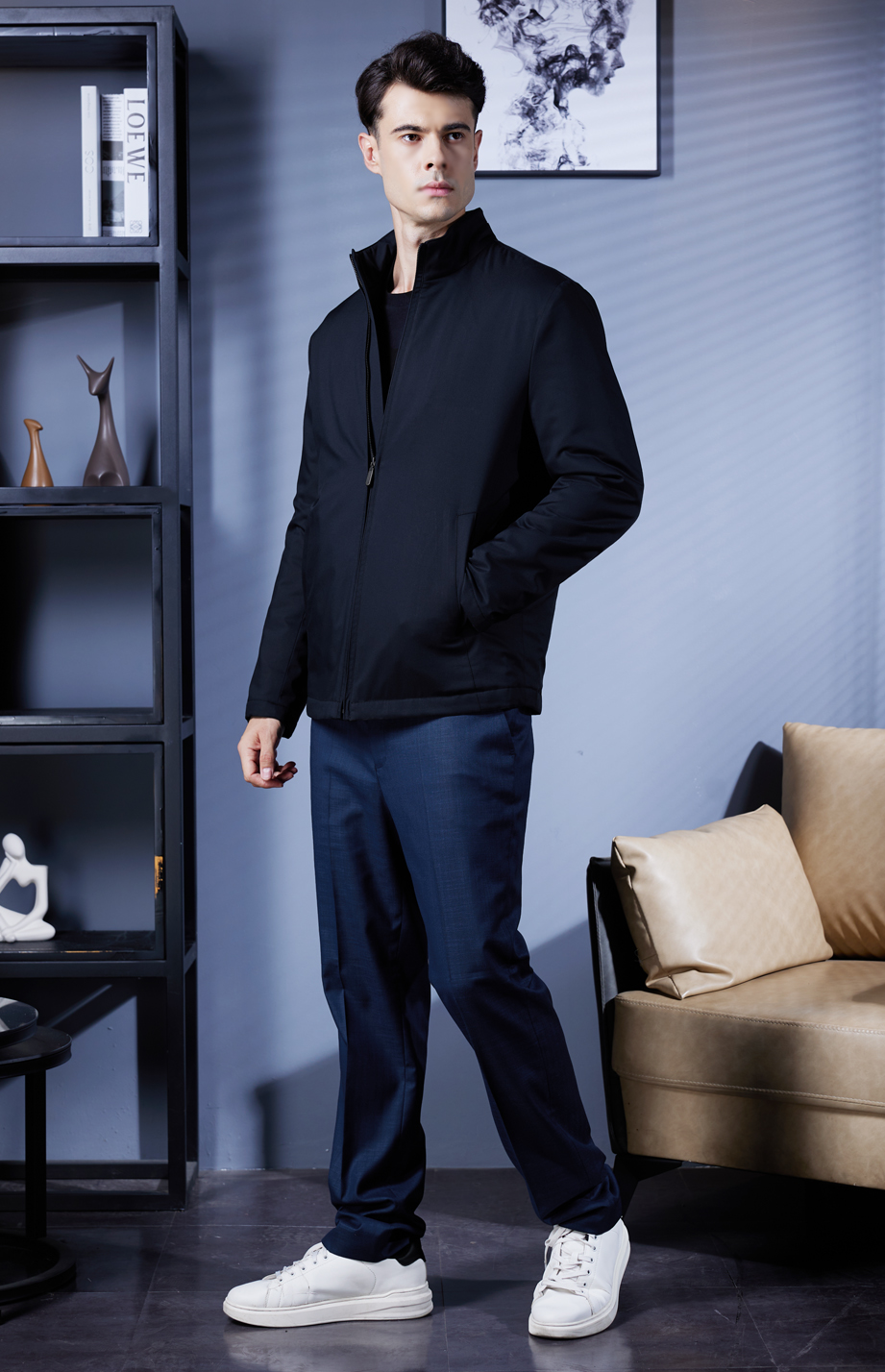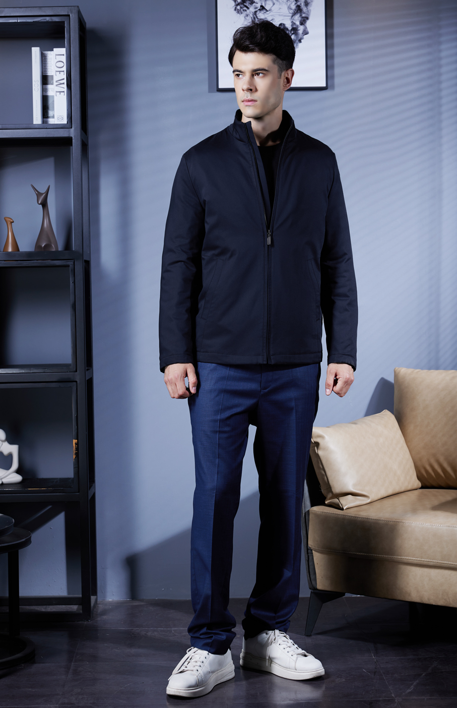 | 款名: | 藏青色聚酯粘胶混纺商务棉服 | |||