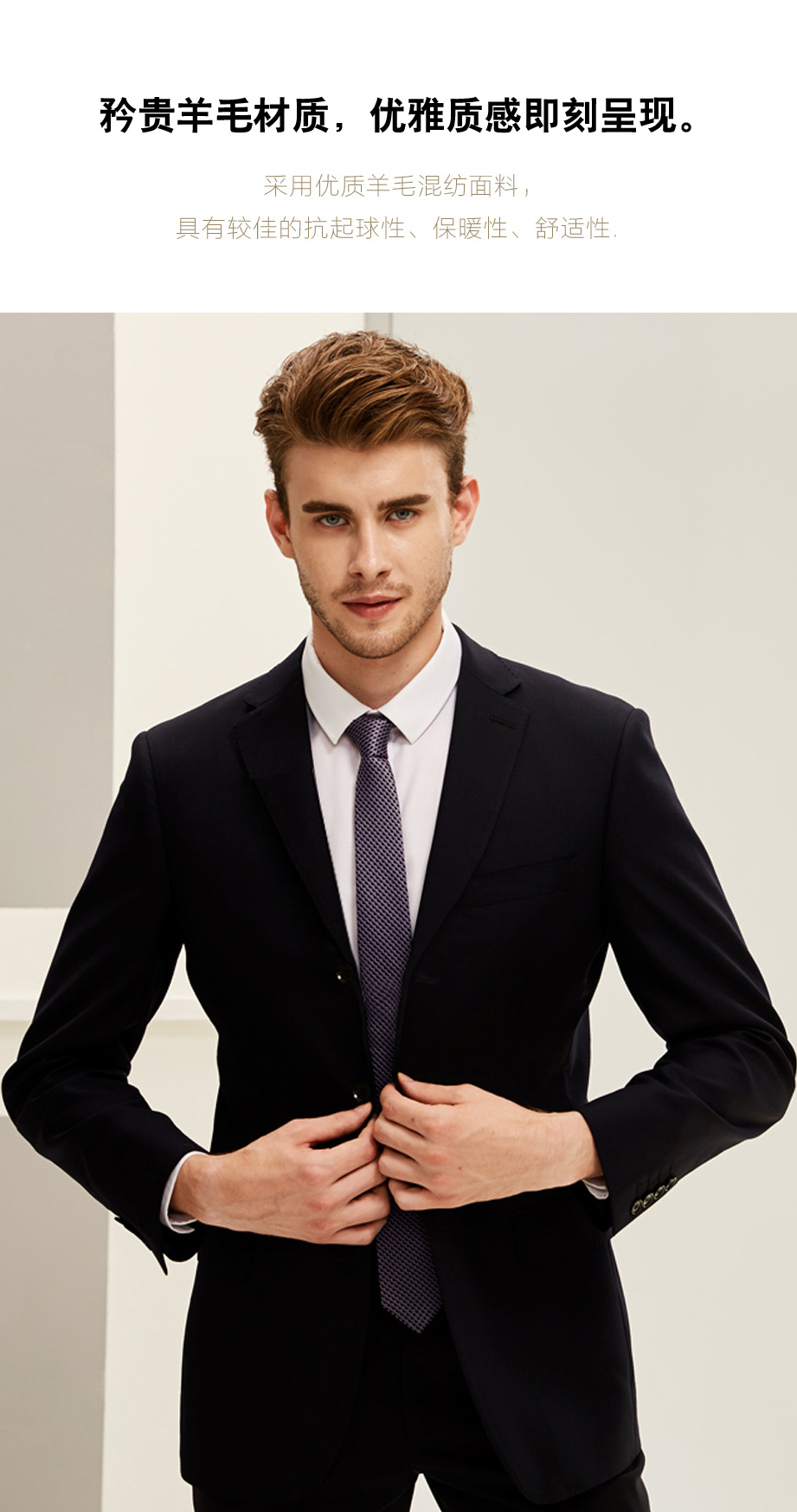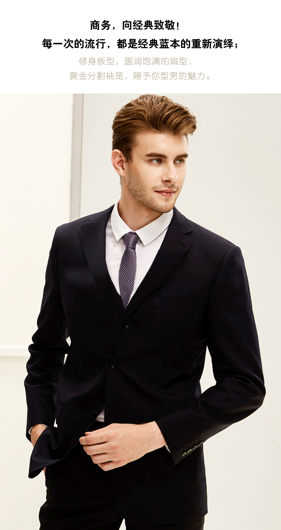 | 款名: | 藏蓝色三粒扣无开衩哔叽羊毛混纺(48.3%毛)平驳领商务西装上衣 | |||||