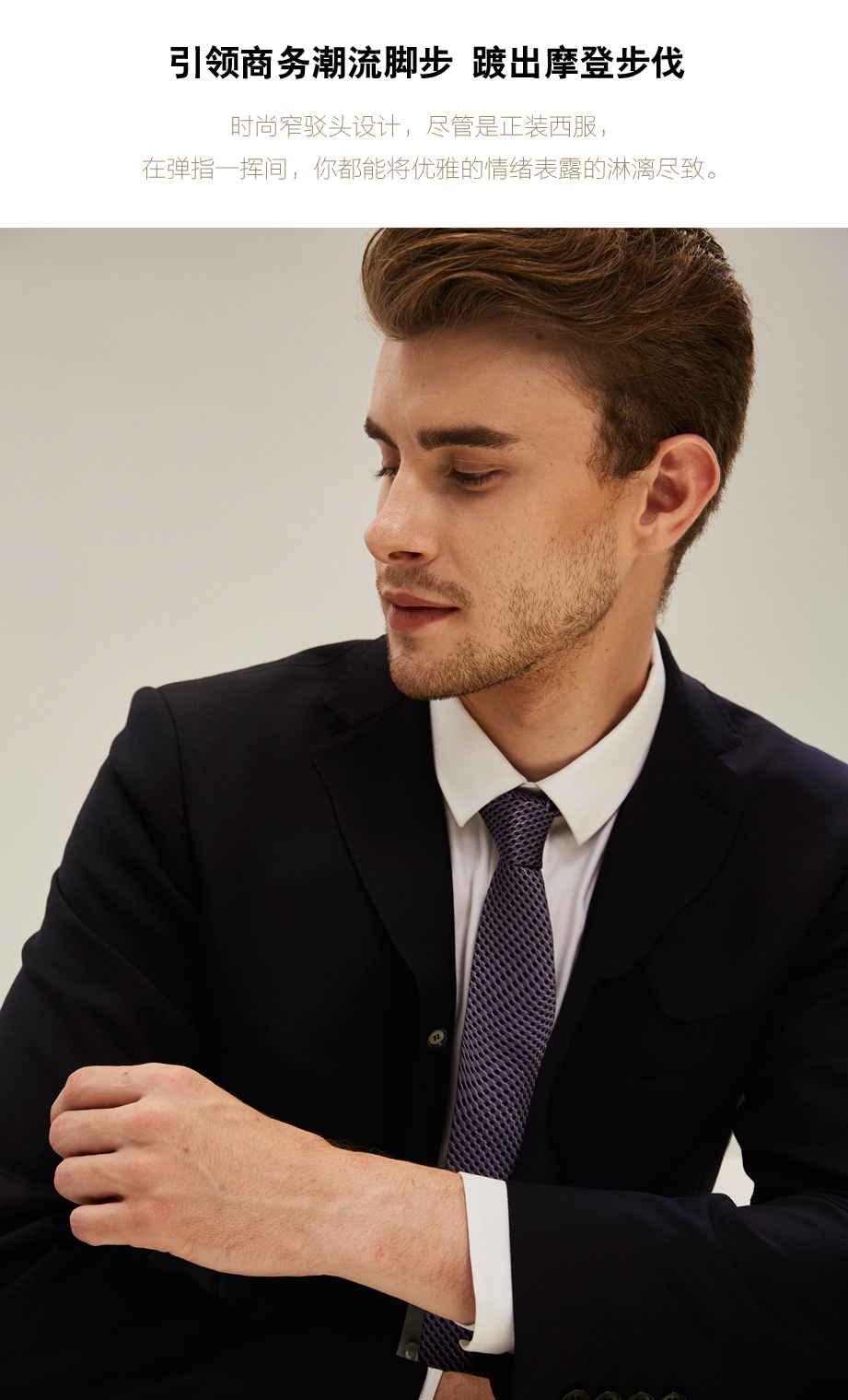 时尚窄平驳领设计,衣襟自然贴体,前胸立体挺括。