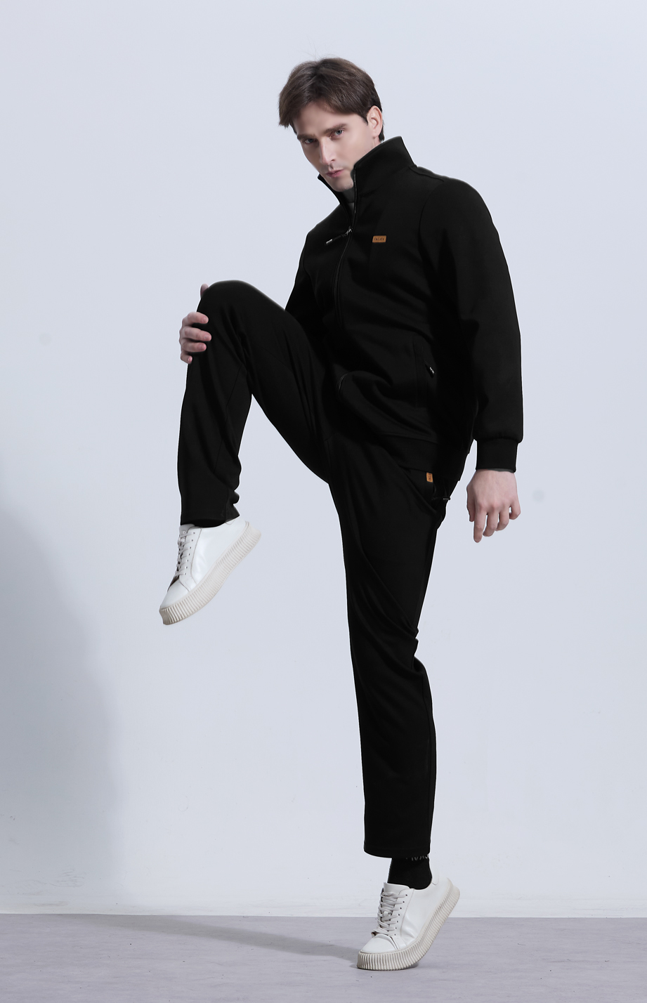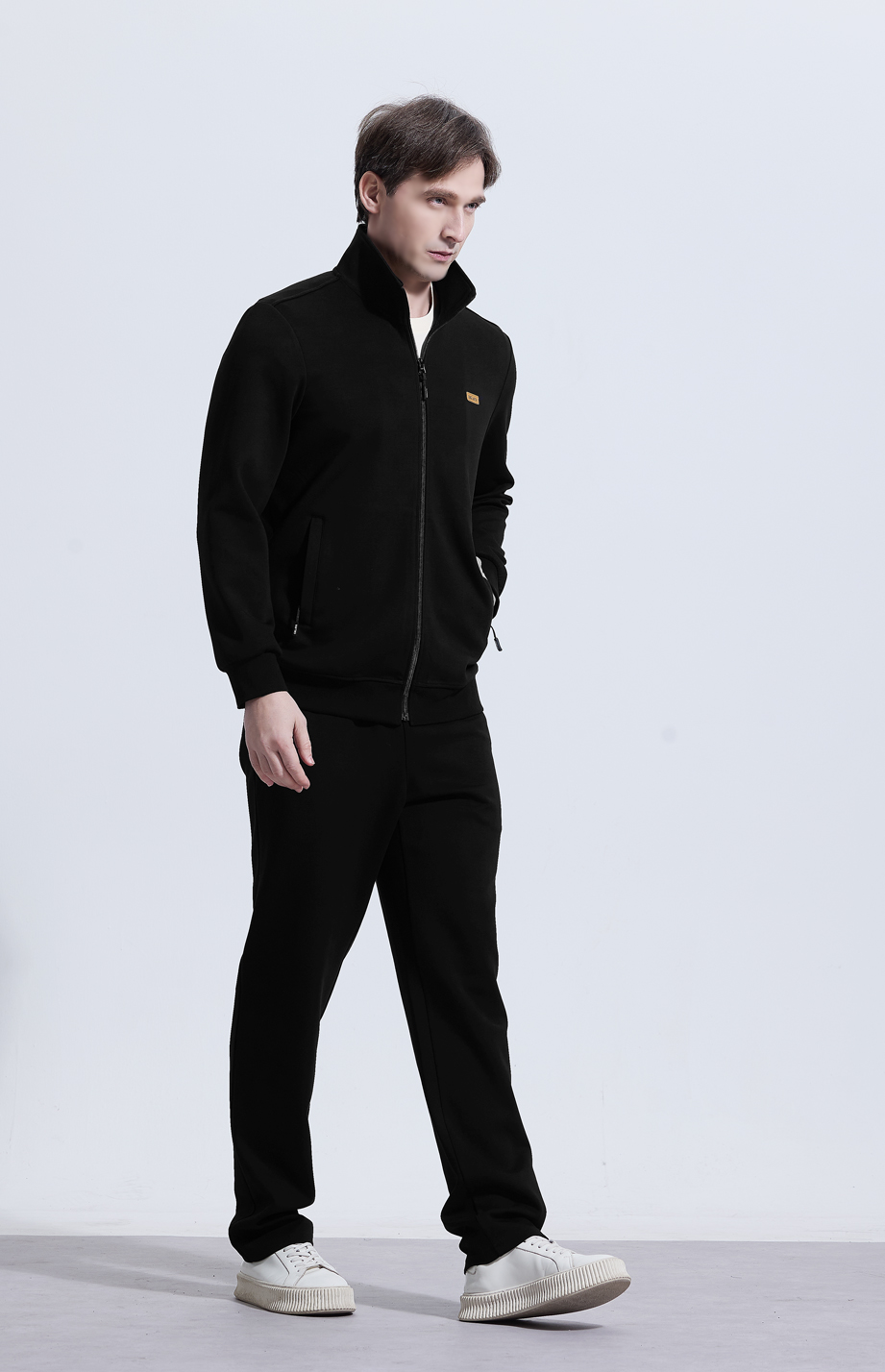 黑色棉聚酯纤维混纺有挂面立翻领春夏商务运动装上衣 |