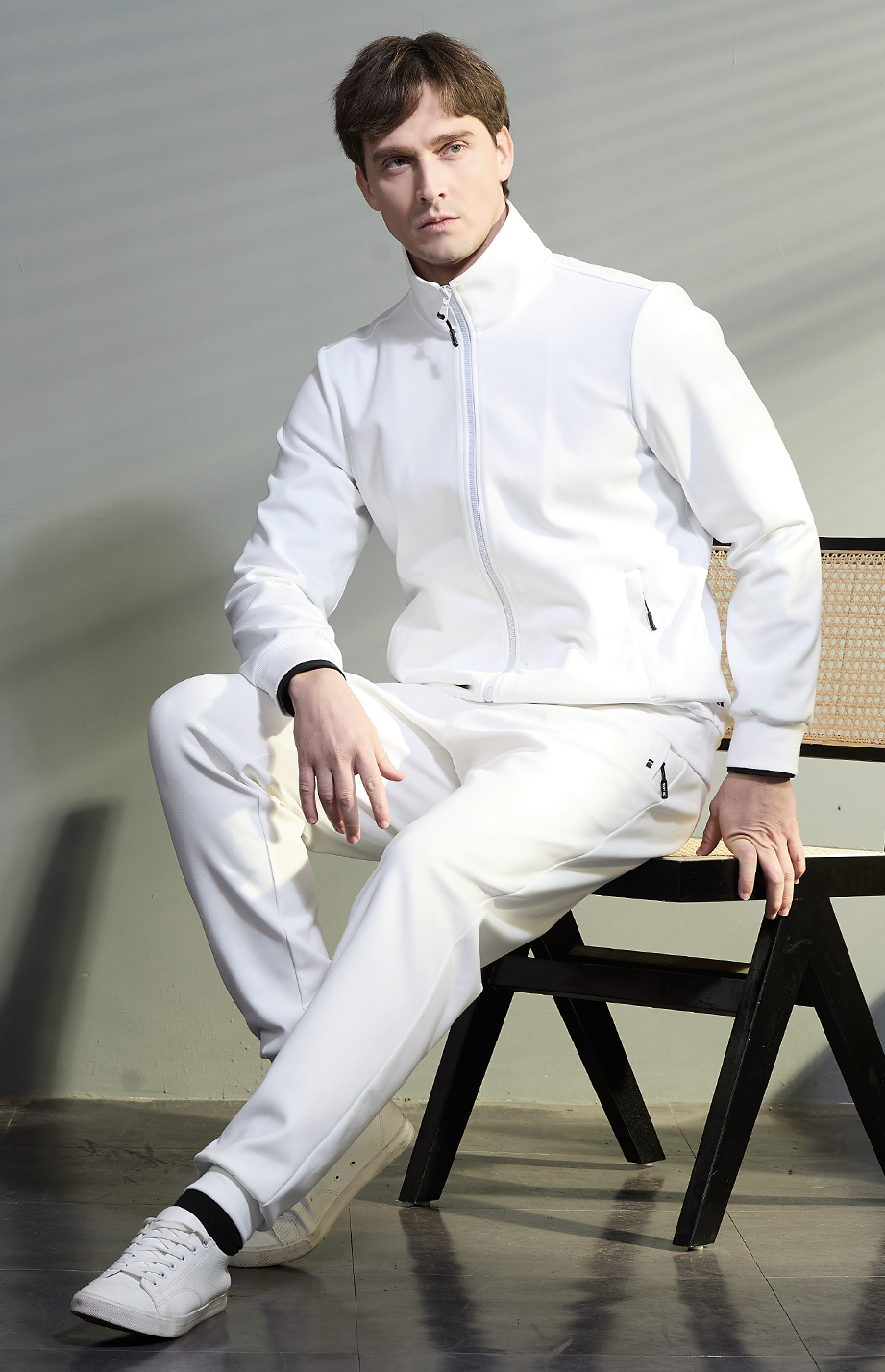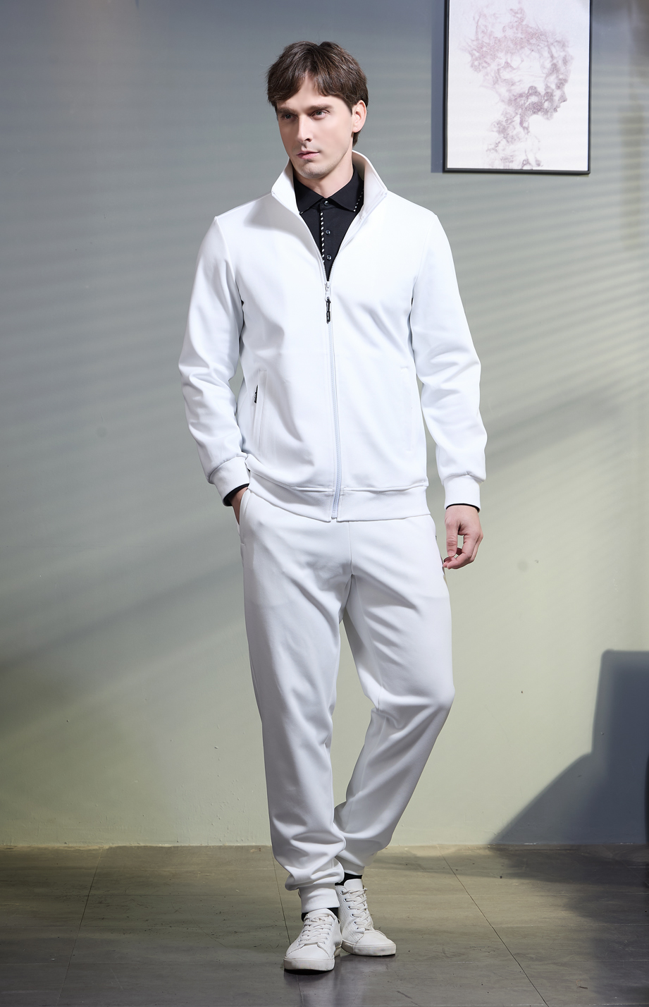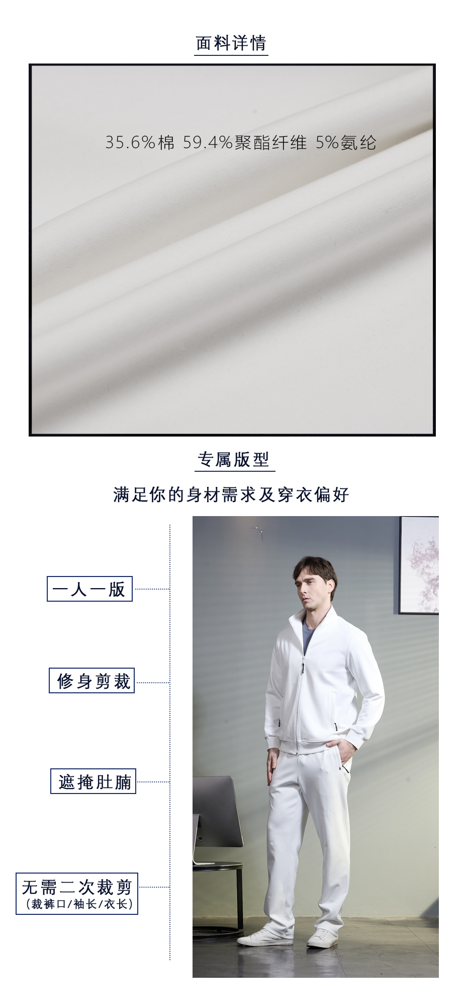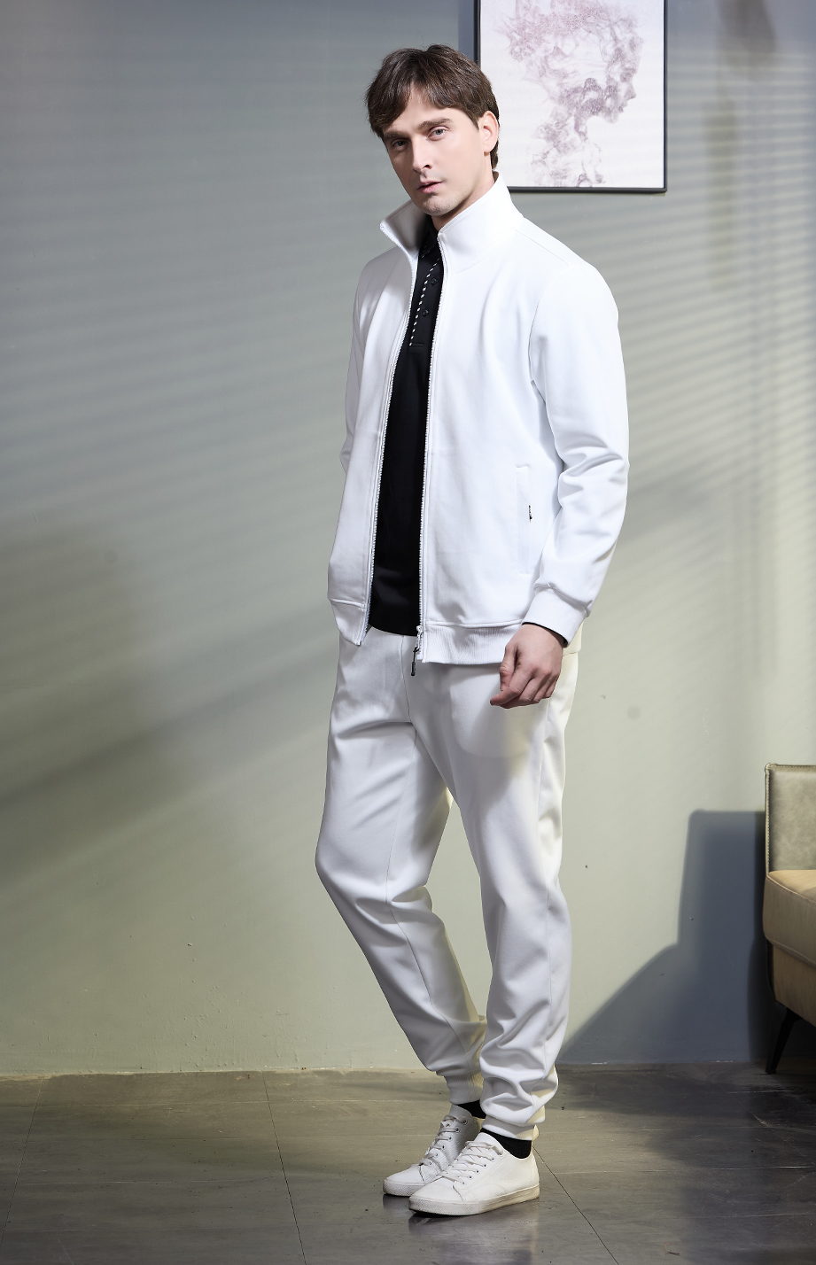 白色棉聚酯纤维混纺有挂面立翻领春夏商务运动装上衣 |