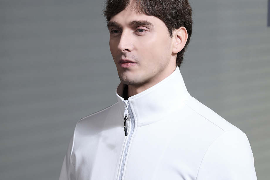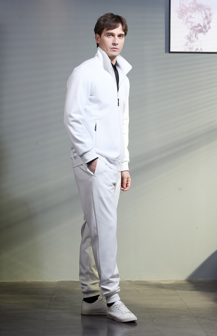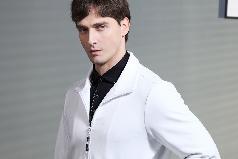 | 款名: | 白色棉聚酯纤维混纺有挂面立翻领春夏商务运动装上衣 | |||