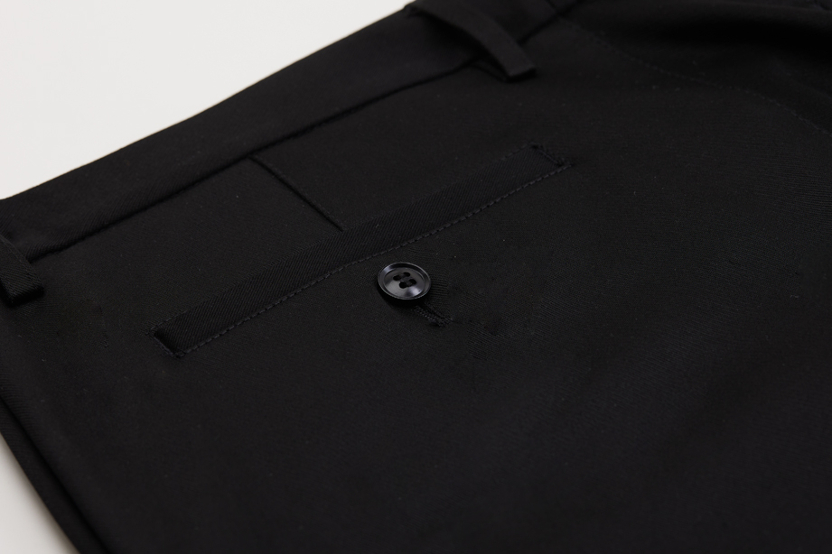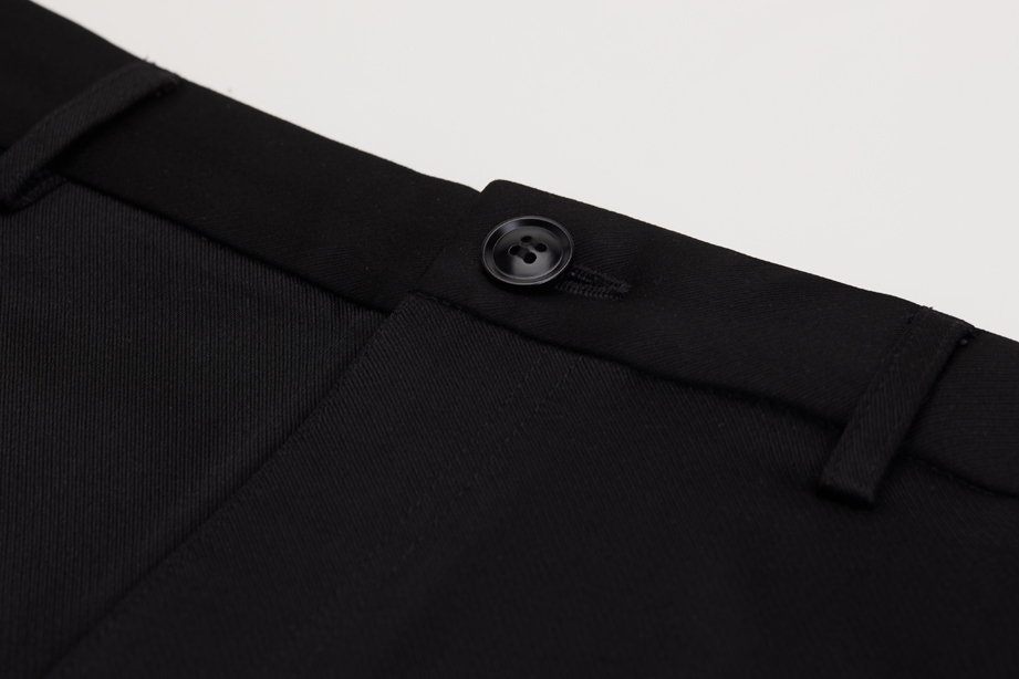 经典腰头设计,平整有型;圆润富有光泽的树脂纽扣,精致美观,十字走线防脱落。