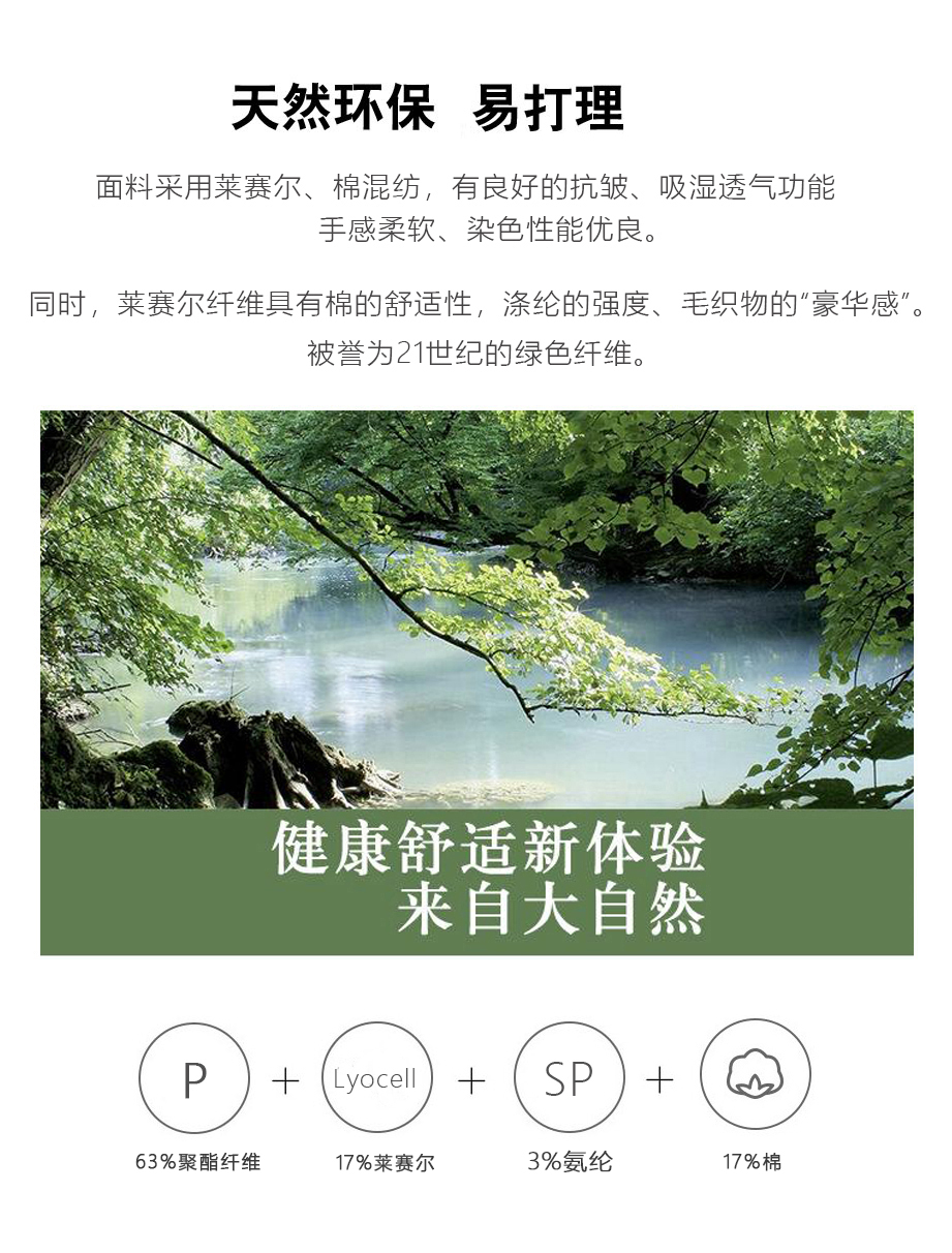 | 面料: | 17%莱赛尔63%聚酯纤维17%精梳棉3%氨纶 | |||