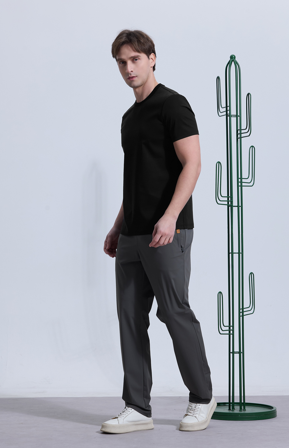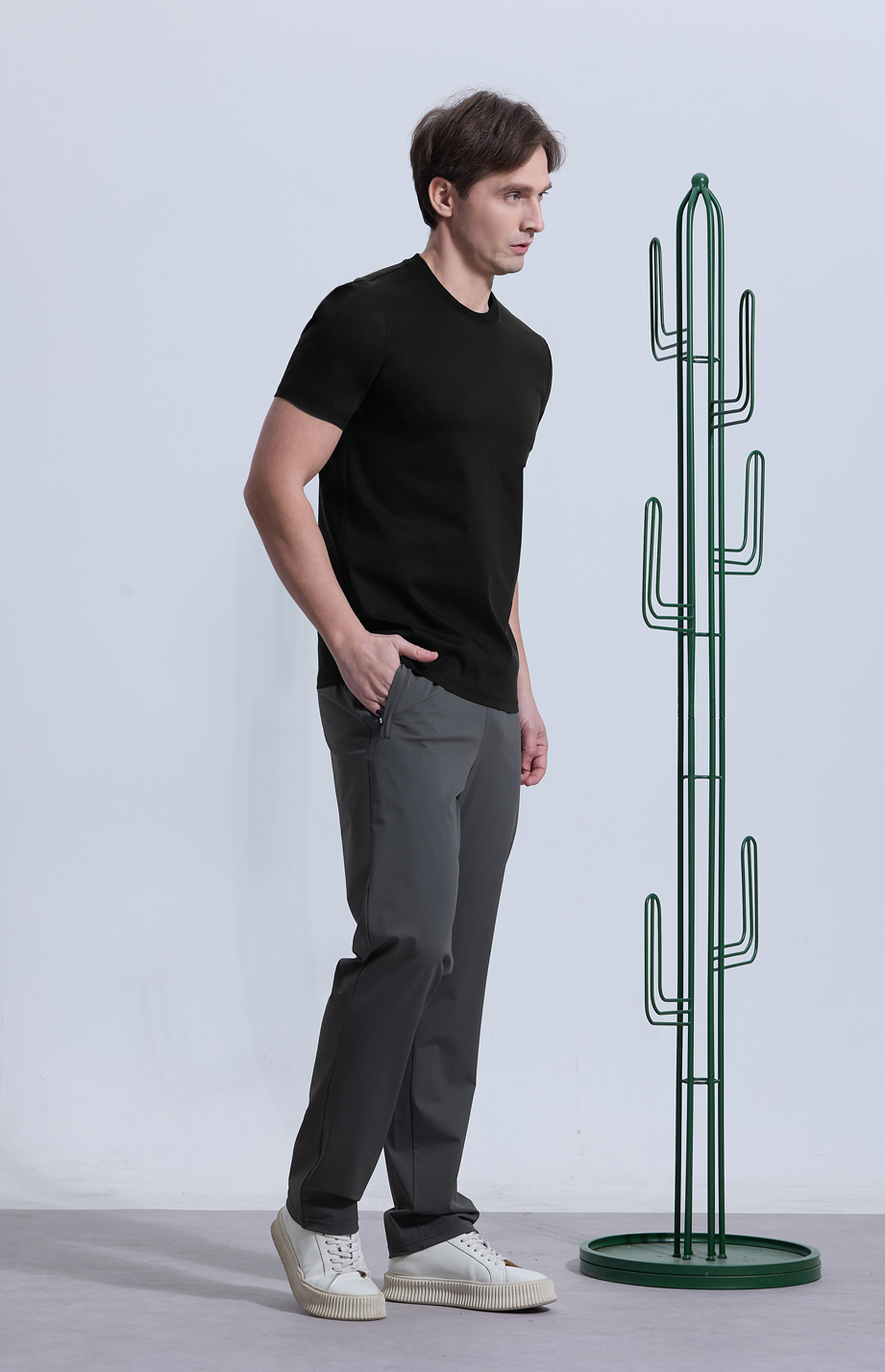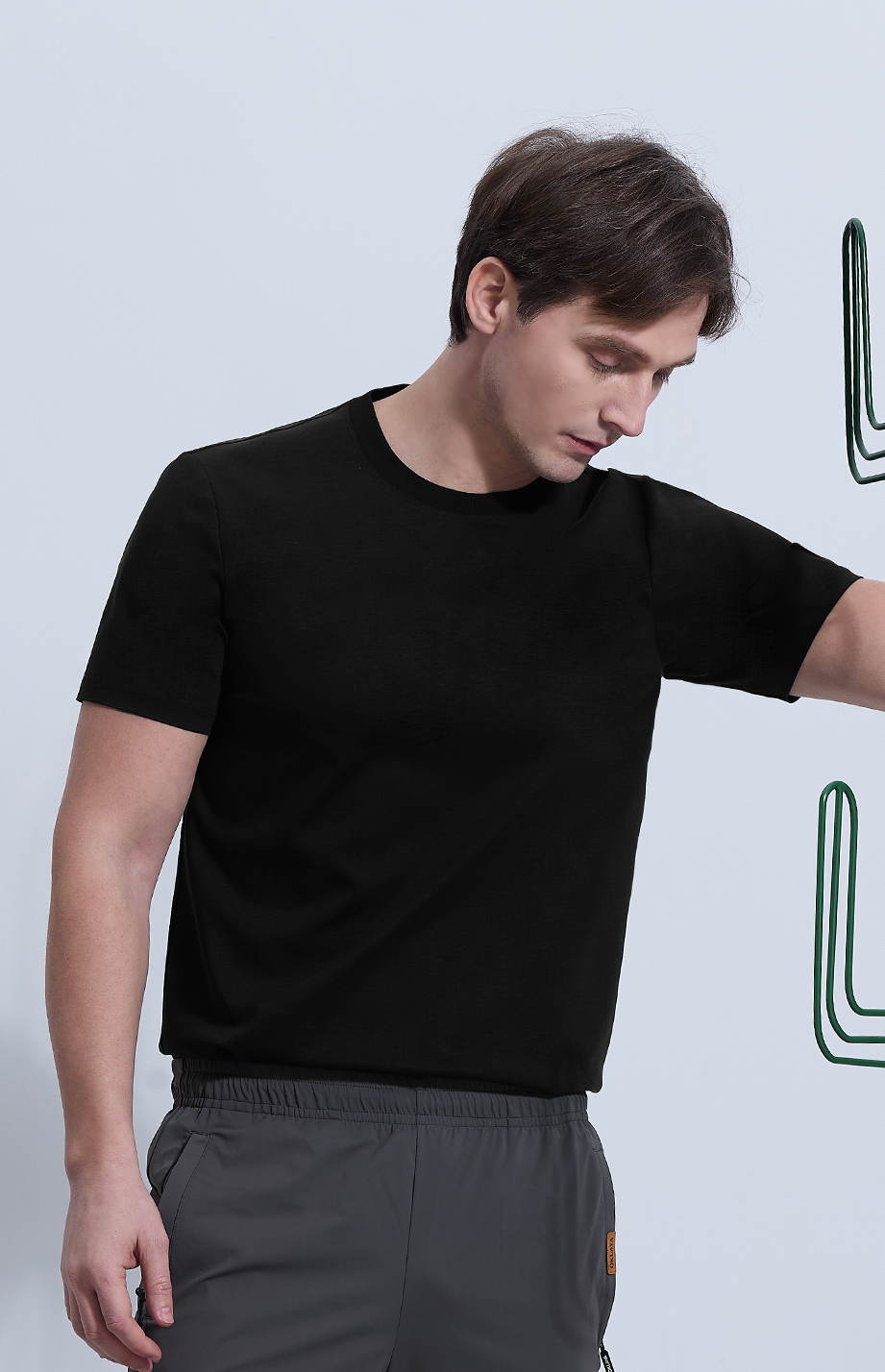| 款名: | 黑色63%棉天丝汉麻纤维混纺丝光圆领短袖T恤 | |||