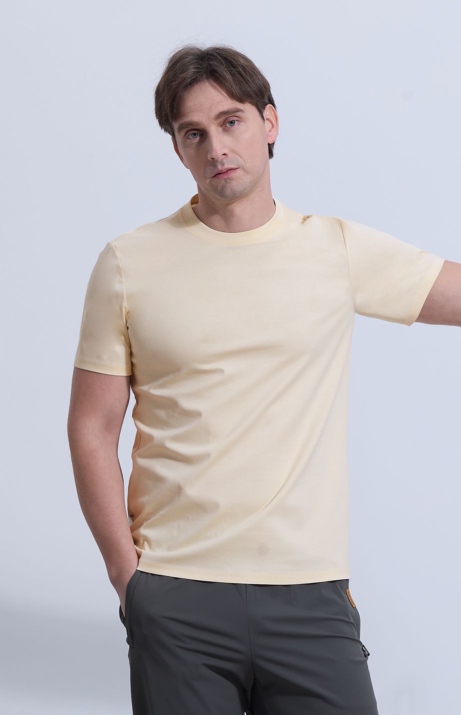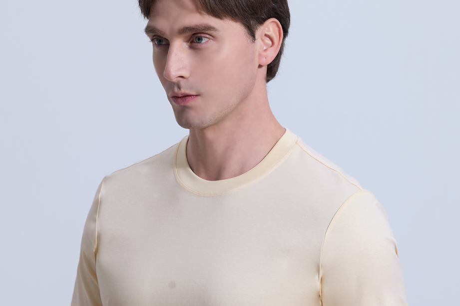 | 款名: | 香槟米63%棉天丝汉麻纤维混纺丝光圆领短袖T恤 | |||||