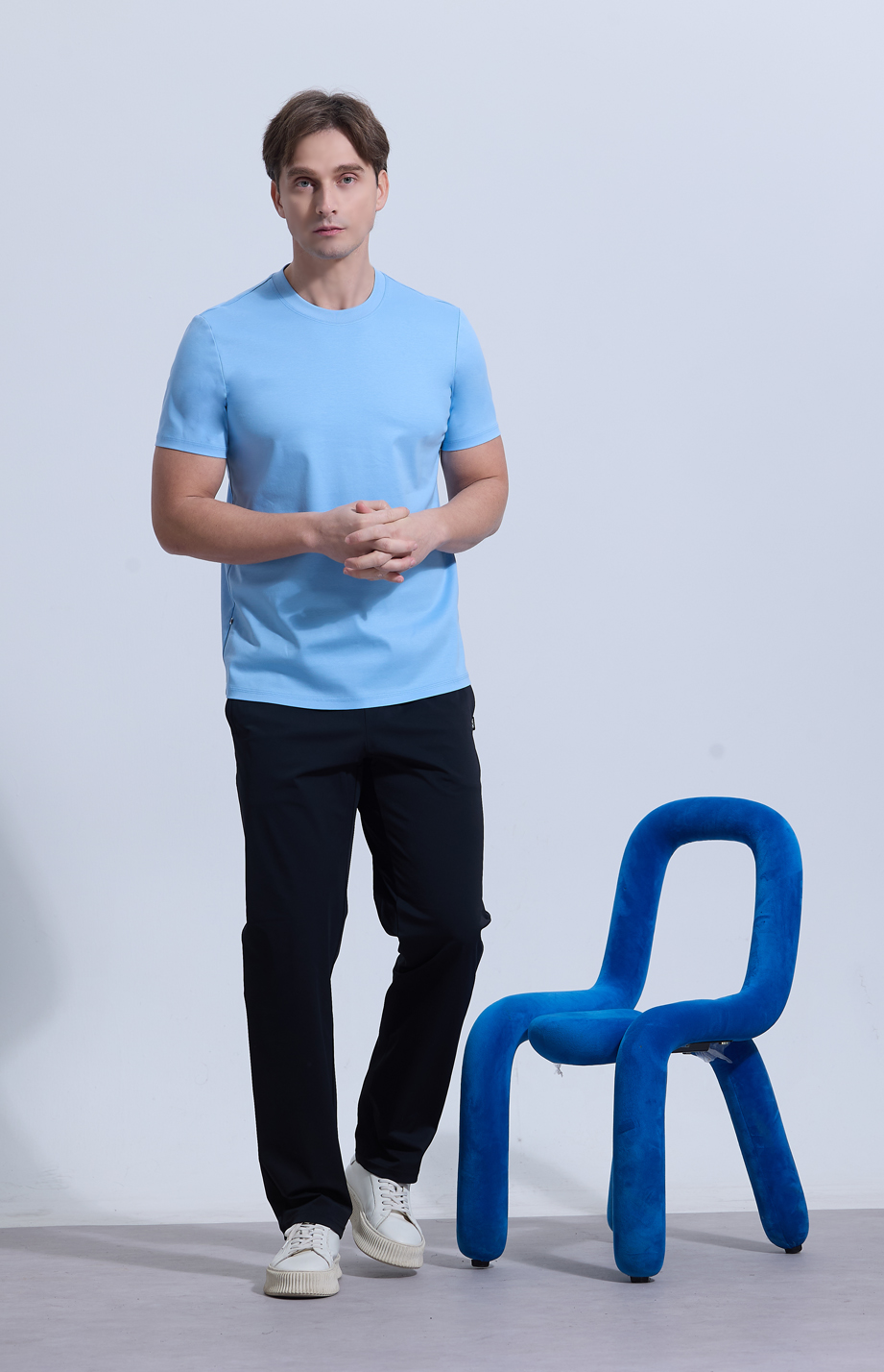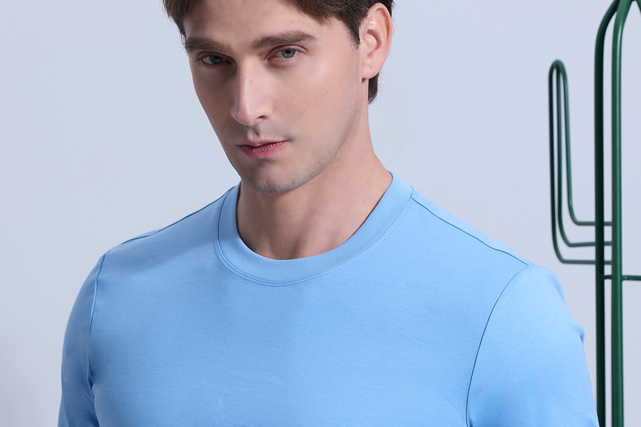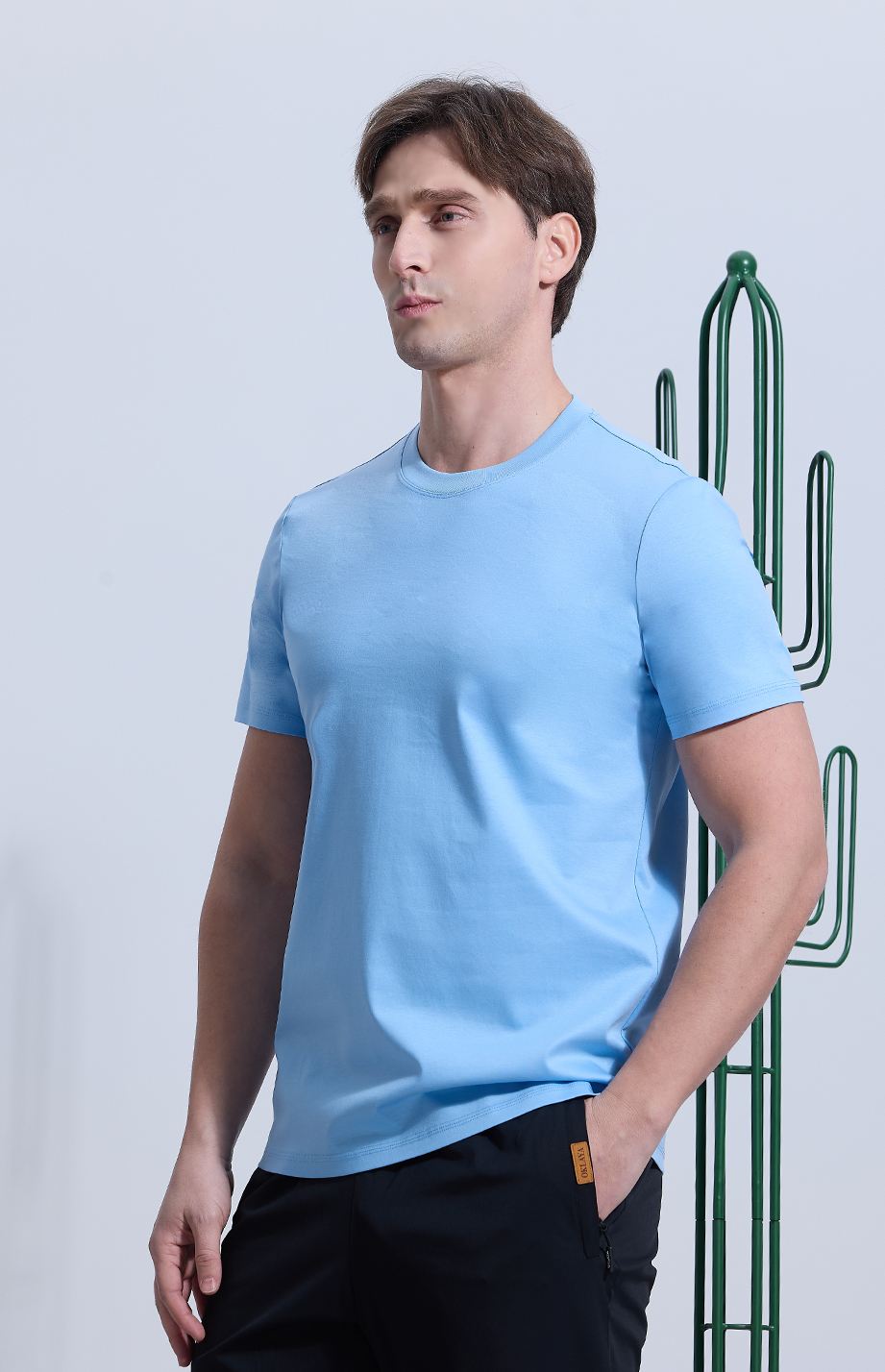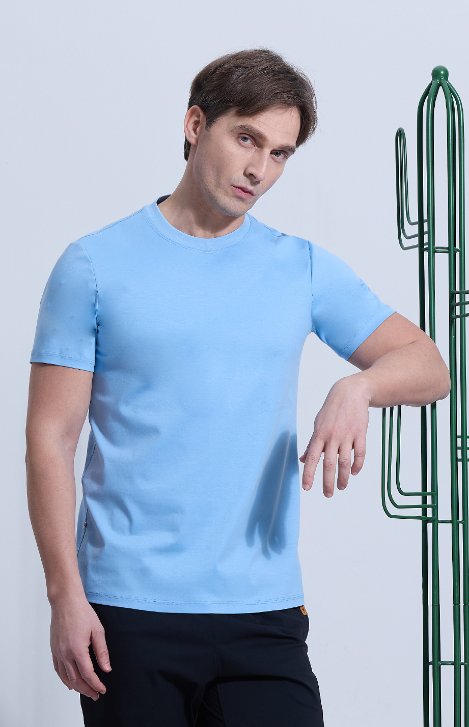 | 款名: | 远景蓝63%棉天丝汉麻纤维混纺丝光圆领短袖T恤 | |||