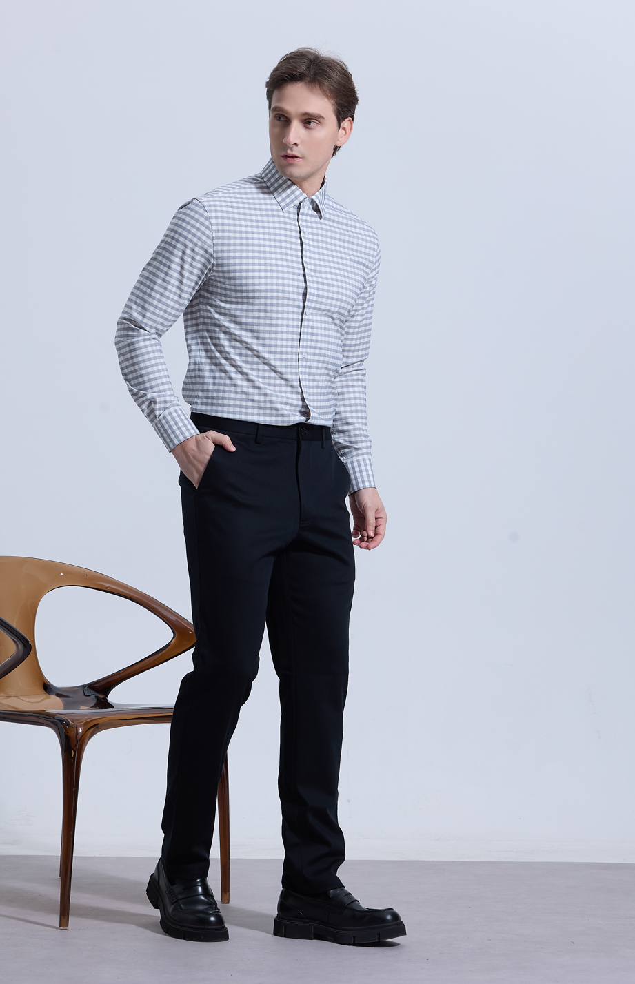经典腰头设计,平整有型;圆润富有光泽的树脂纽扣,精致美观,十字走线防脱落。