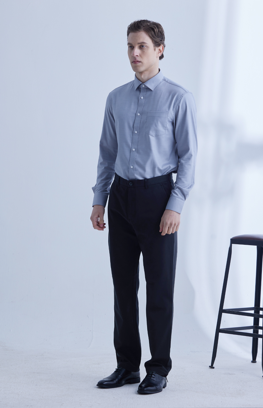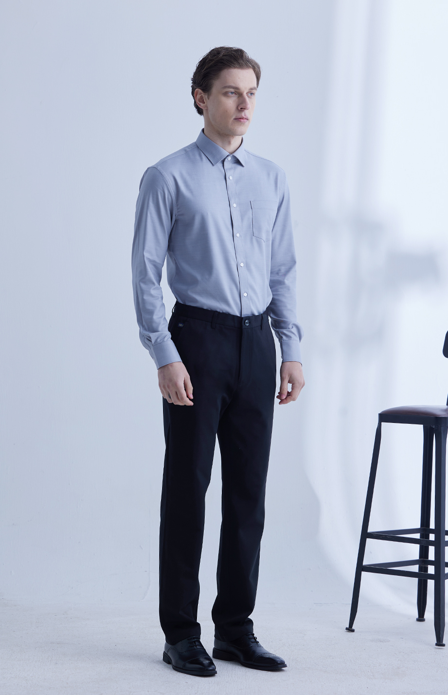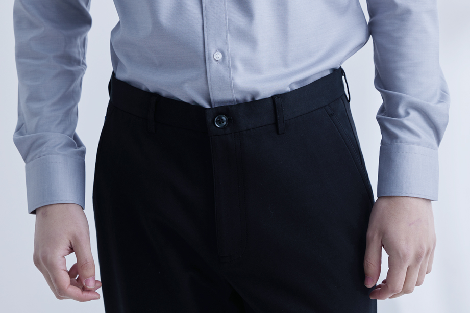 经典腰头设计,平整有型;圆润富有光泽的树脂纽扣,精致美观,十字走线防脱落。