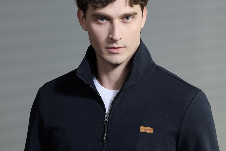 深宝蓝棉聚酯纤维混纺有挂面立翻领春夏商务运动装上衣 |