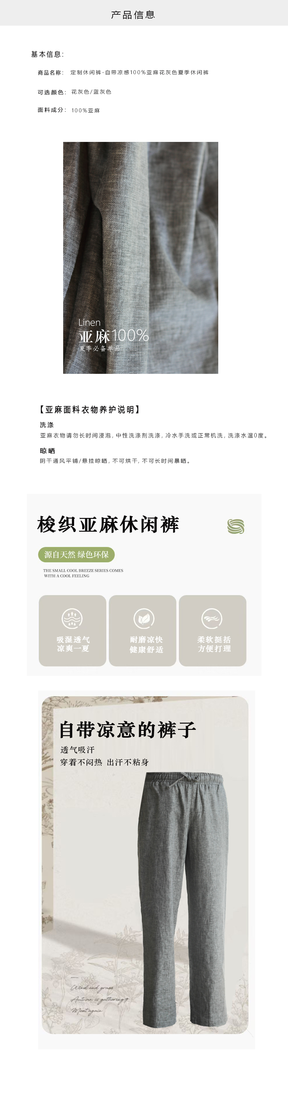 | 款名: | 定制休闲裤-自带凉感100%亚麻花灰色松紧腰(带抽绳)夏季休闲裤 | |||||