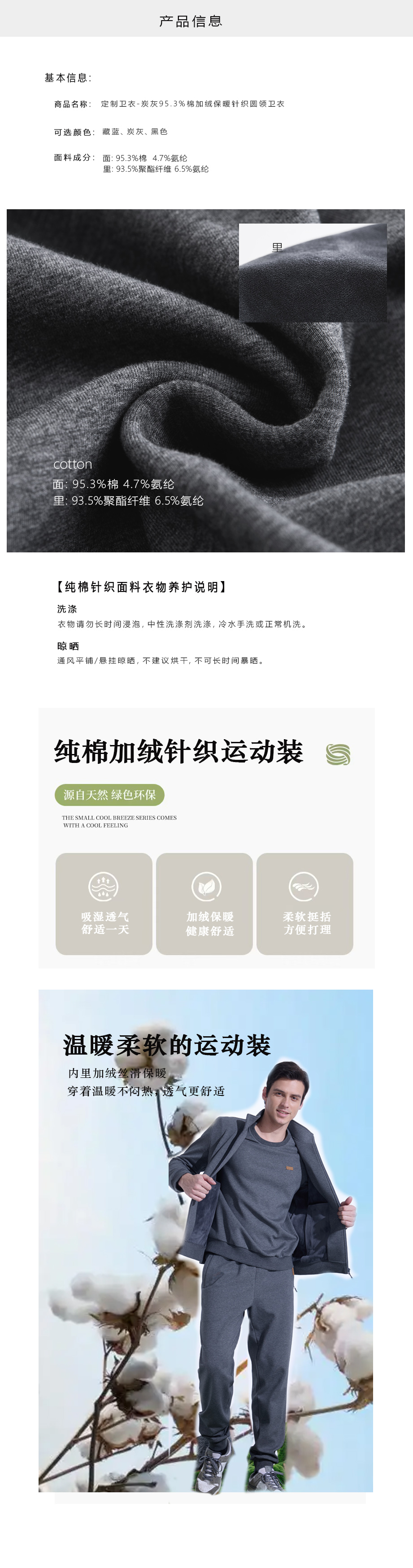 | 款名: | 定制卫衣-炭灰色95.3%棉加绒保暖针织圆领卫衣 | |||