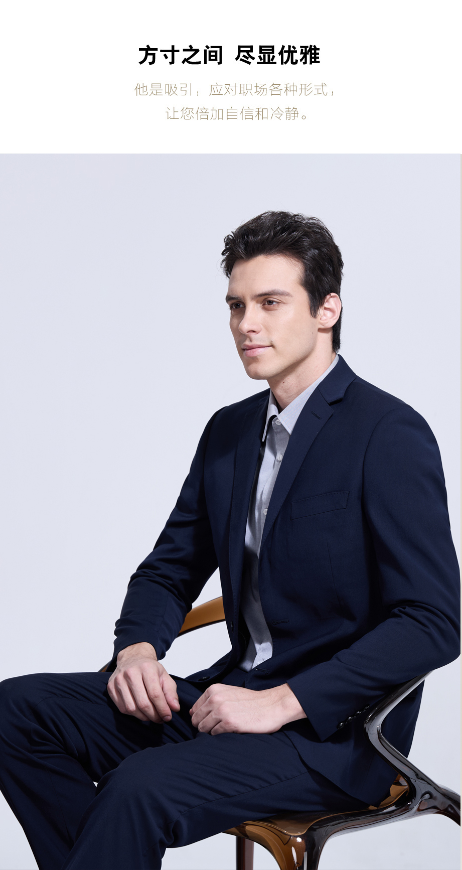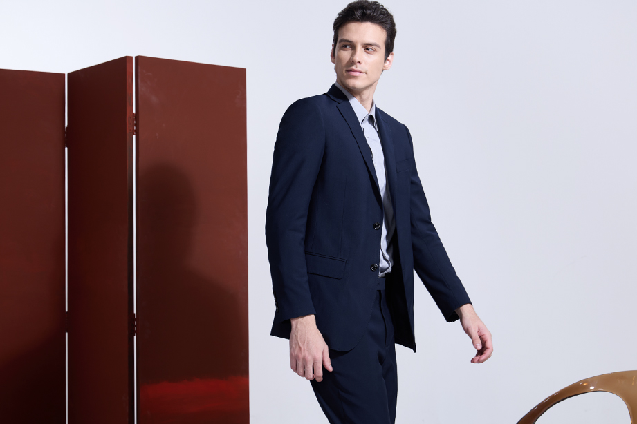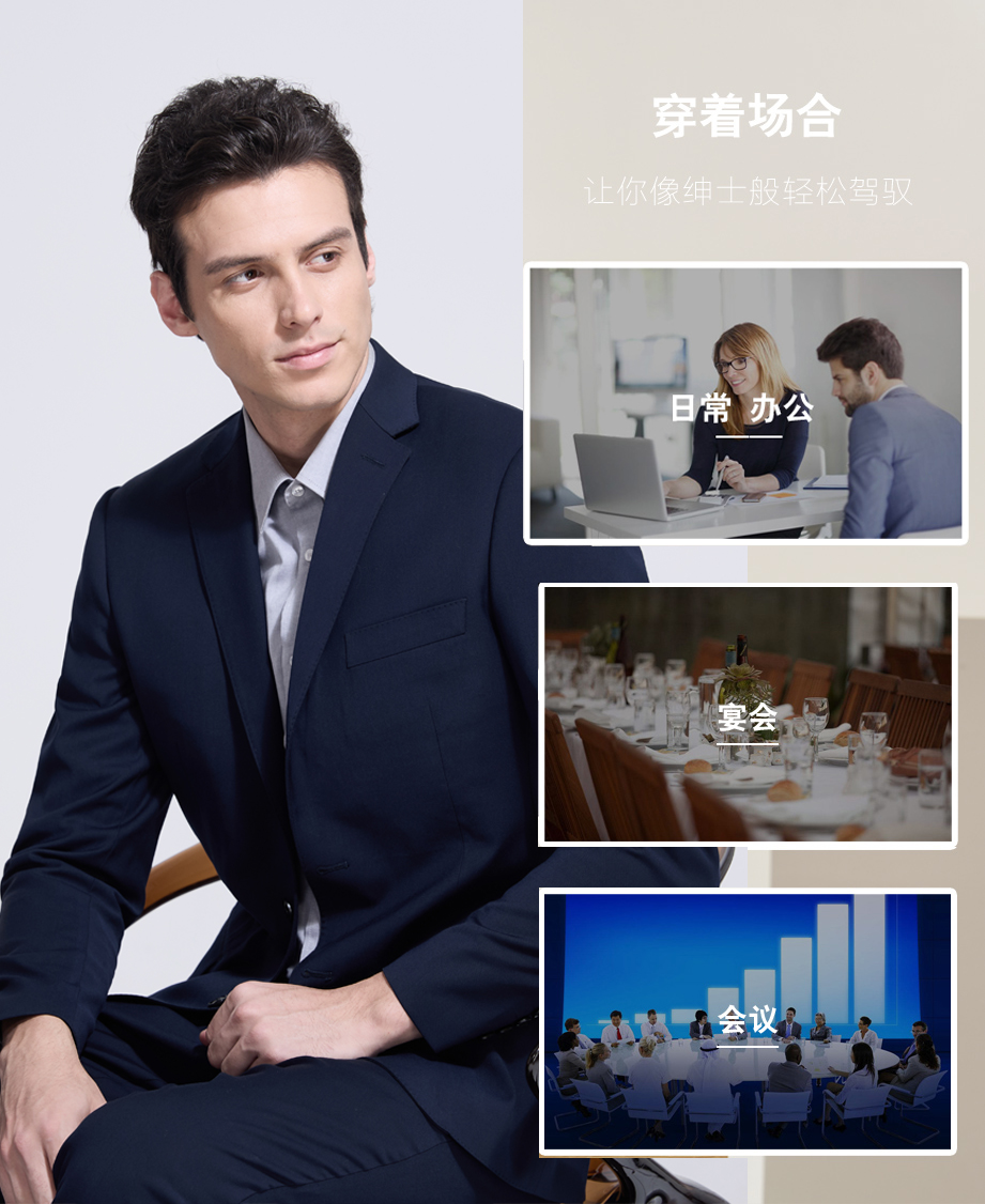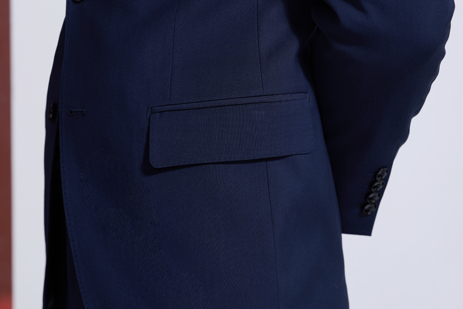 | 款名: | 定制西装-藏蓝色65%涤纶粘胶混纺平驳头两粒扣无开衩商务西装上衣 | |||||