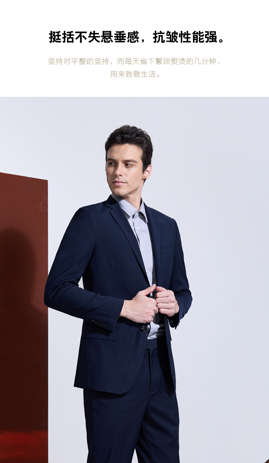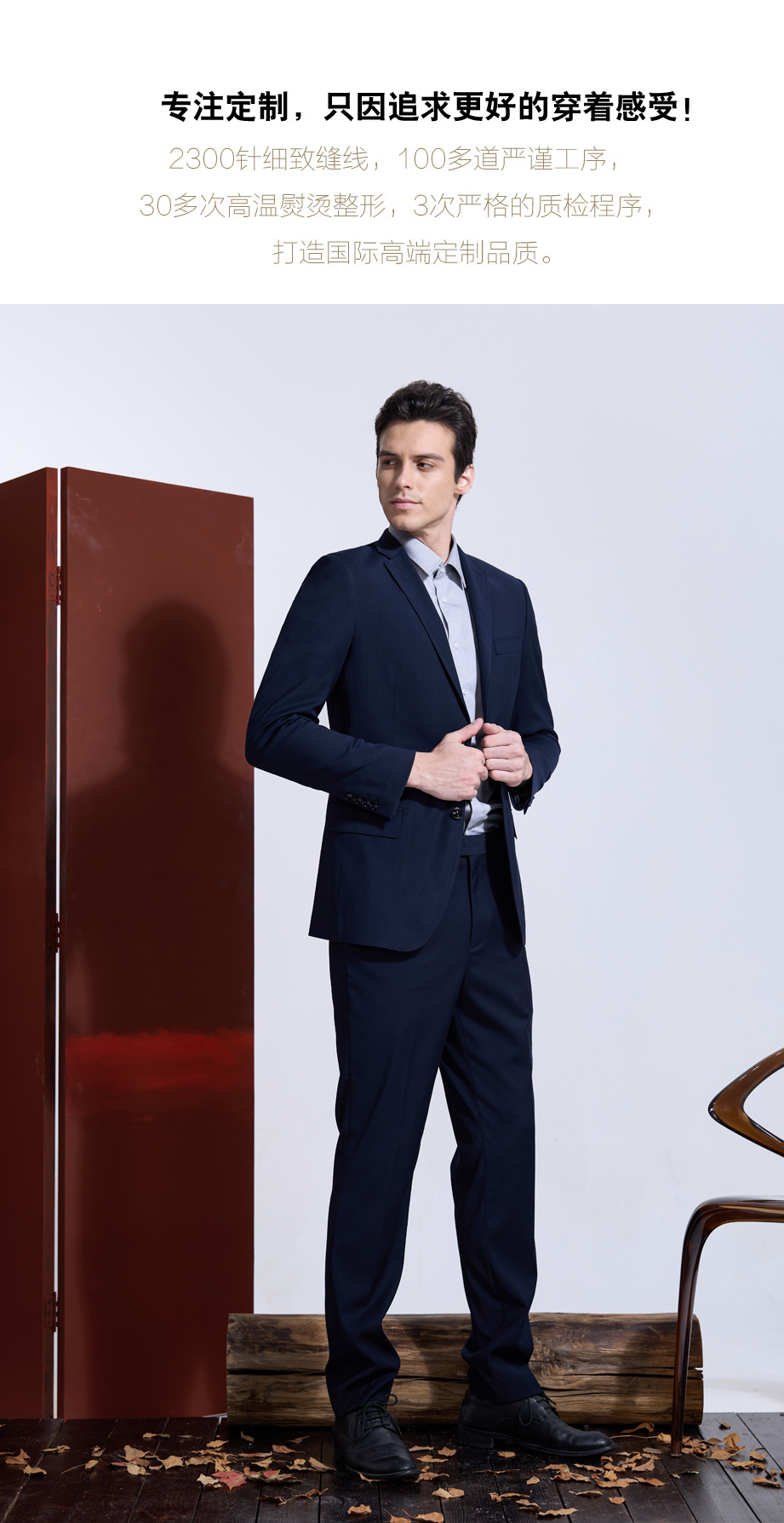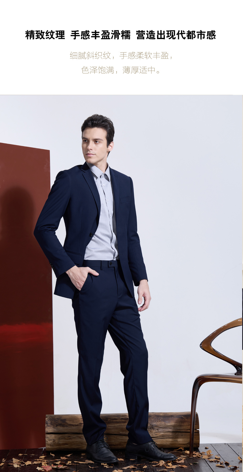 | 款名: | 定制西装-藏蓝色65%涤纶粘胶混纺平驳头两粒扣无开衩商务西装上衣 | |||||