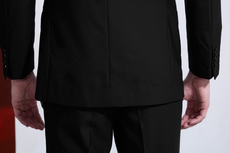 | 款名: | 定制西装-黑色100%绵羊毛贡丝锦两粒扣平驳领商务西装上衣 | |||||