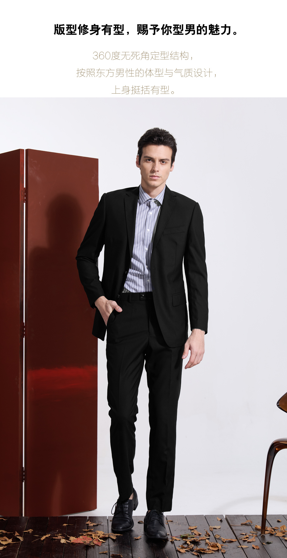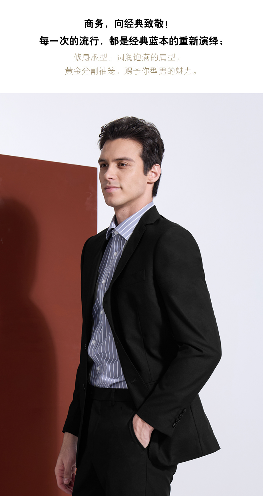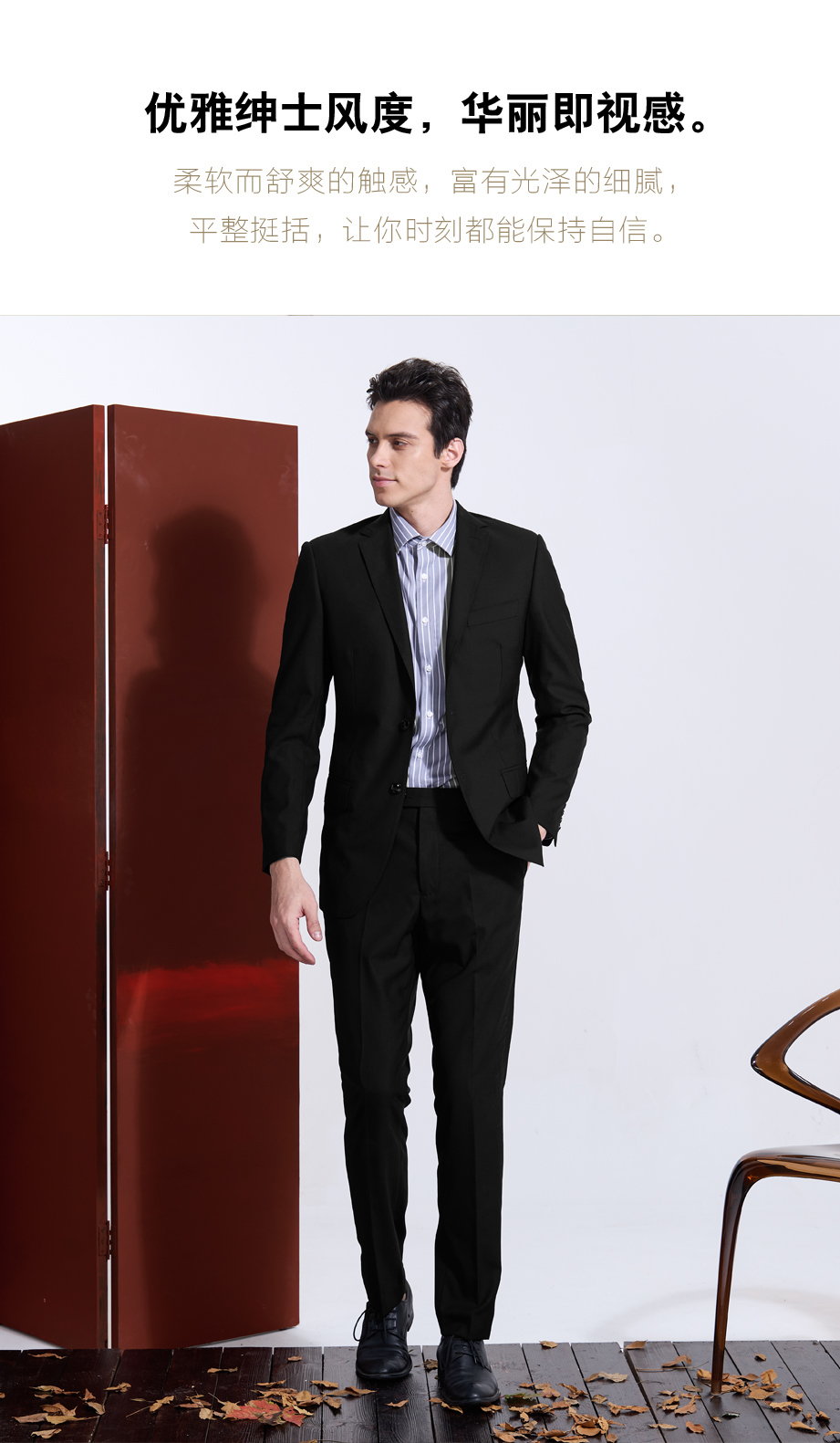 | 款名: | 定制西装-黑色100%绵羊毛贡丝锦两粒扣平驳领商务西装上衣 | |||