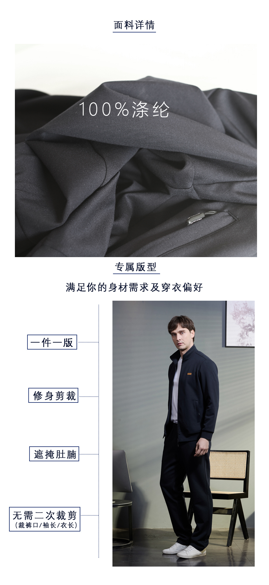 侧斜插口袋造型自然,平整美观,符合人体手型设计;兜内加拉链可以装一些随身小物品,实用方便。